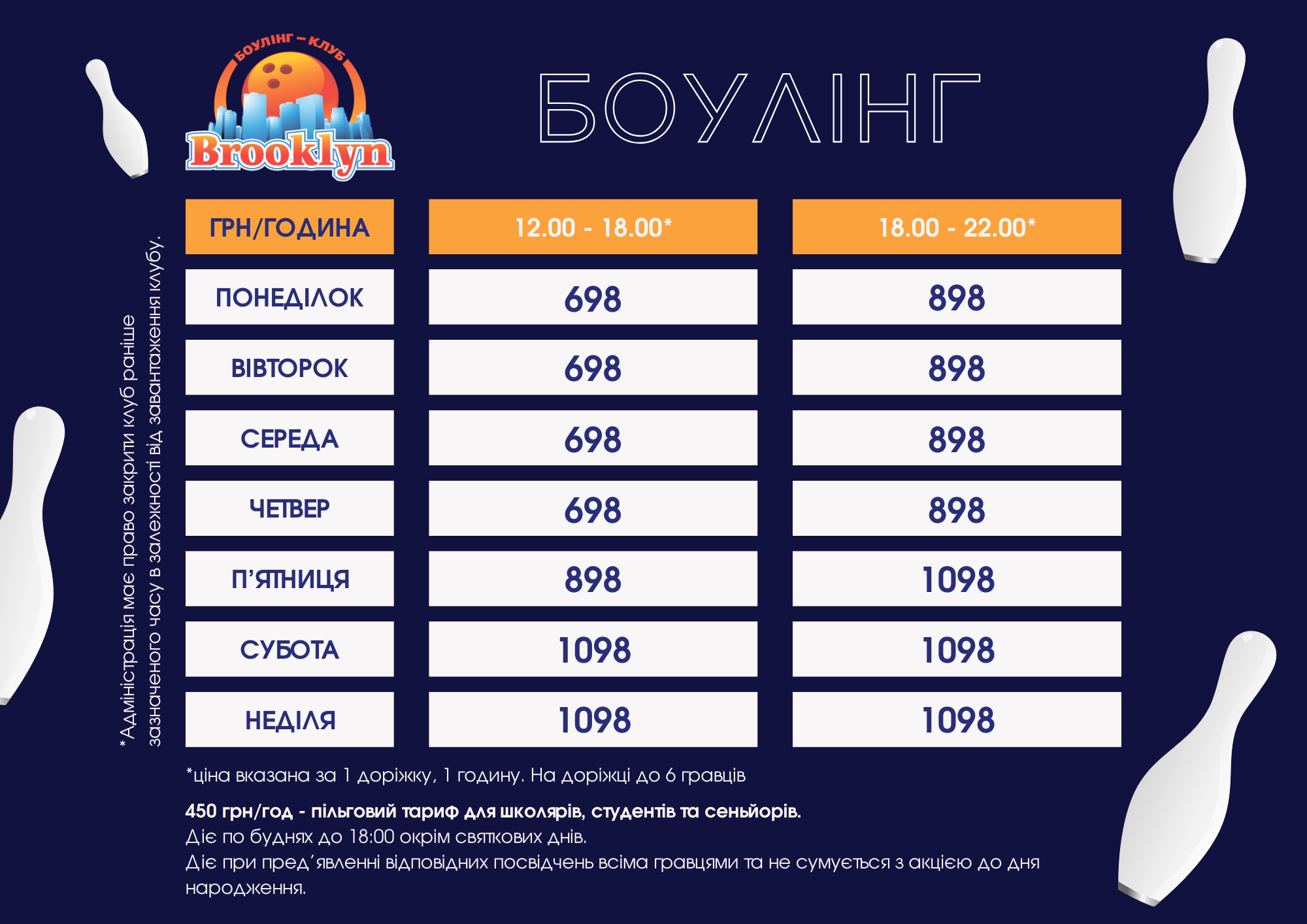 На території Боулінг клубу «BROOKLYN» 14 доріжок для боулінгу, 9 більярдних столів (5 російських і 4 американки), окрема зала місткістю до 40 осіб.